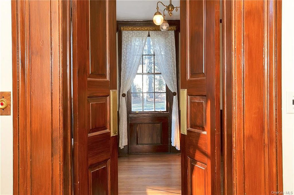 Enter the estate through iron gates, adding a touch of mystique and seclusion, one is instantly transported to a different century, passing by European inspired sculptures and antique street lamps domestically imported from the streets of Philadelphia, leading up to a circular driveway. The grand private front portico, framed by dramatic, soaring columns, overlooks the expansive grounds, creating a serene outdoor space, rarely duplicated in today's landscape architecture. Internally, original antique chandeliers, gaslights, intricate crown moldings and wide plank hardwood floors run throughout the home, while an opulent staircase with mahogany balustrade and 12' ceilings on the main level establish a luxurious front parlor and living room with twin fireplaces. 8 fireplaces in total with original ornate mantels, formal dining room with elegant French doors, opening to the heated, wood paneled solarium.